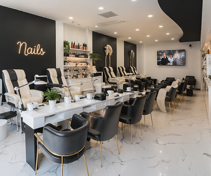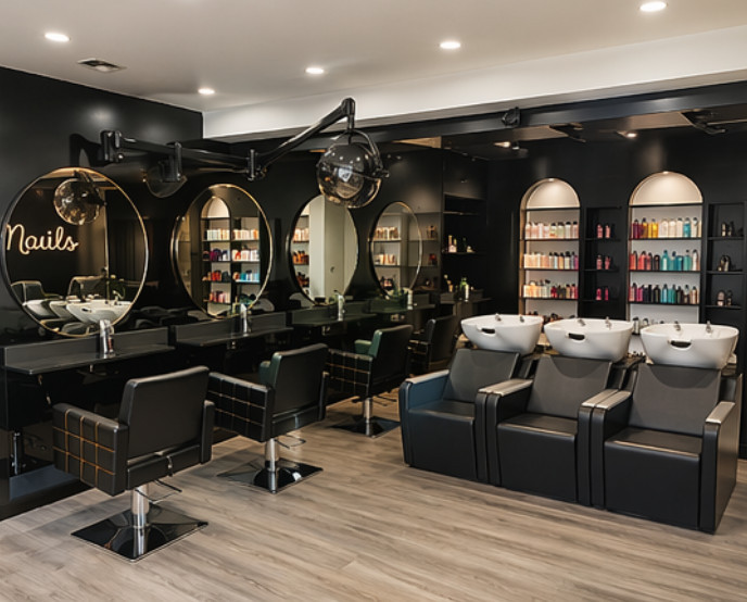Upon entering, the salon opens into a professional and welcoming reception area, leading into a dedicated nail section equipped with multiple manicure and pedicure stations. The hair section is equally well-appointed, featuring several styling and colouring stations along with integrated wash basins, allowing for efficient workflow and high client turnover.