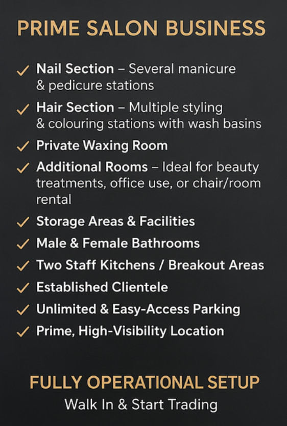 This is an excellent opportunity to acquire a well-established and fully operational beauty and hair salon, successfully trading for over 20 years with a strong reputation and loyal, repeat clientele.
