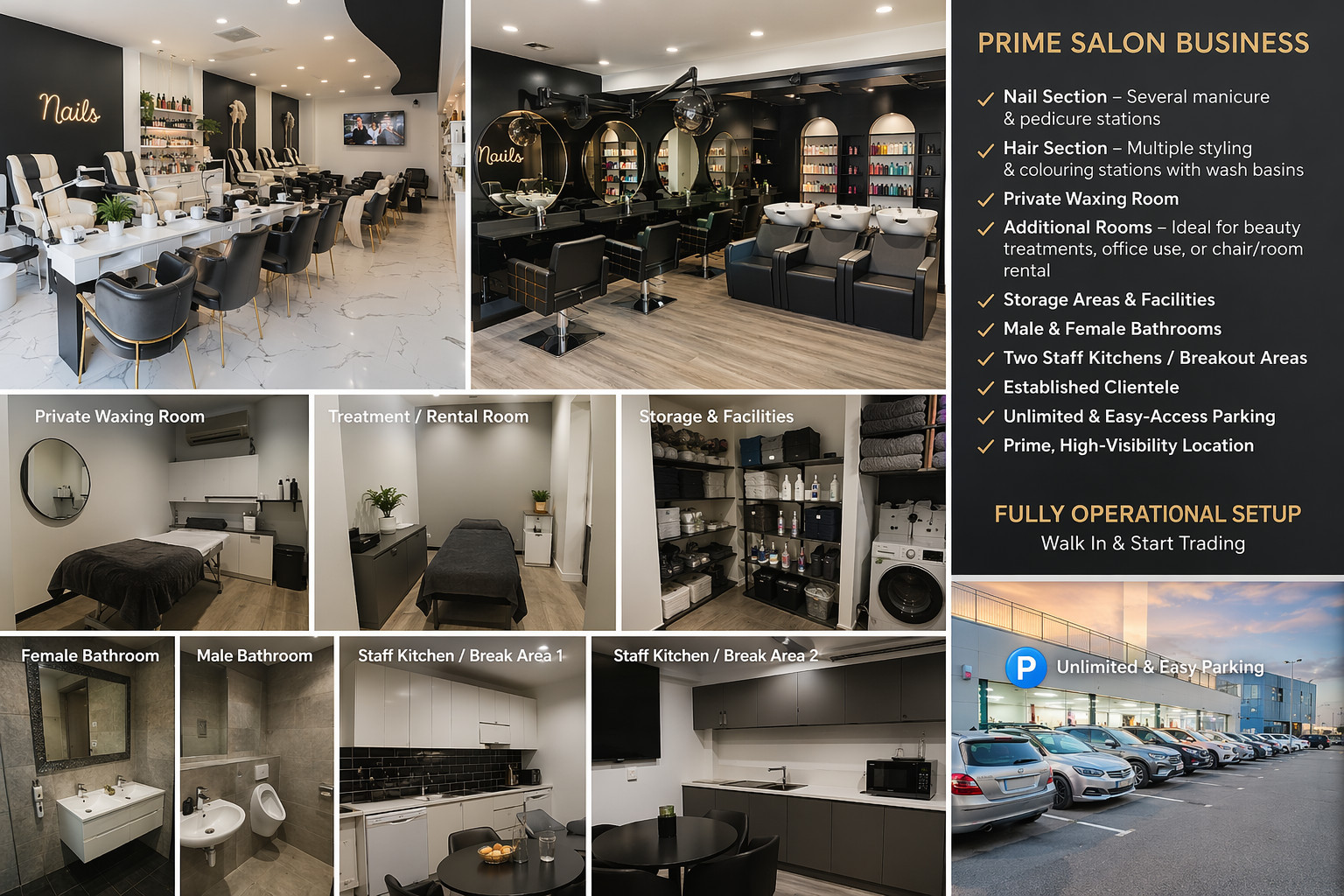 Externally, the property offers unlimited and easy-access parking for both clients and staff, positioned in a prime, high-visibility location that consistently attracts passing trade and walk-in clients.